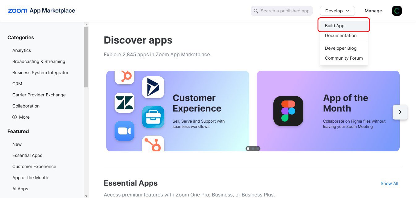 From the navigation menu, select “Develop” and then choose “Build App” from the dropdown menu.
