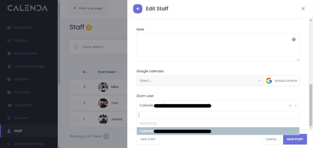 Connect Calenda staff to Zoom users. To do this, go to Calenda > Staff, select and edit the desired staff member, then locate the Zoom user field at the bottom of the edit form. Select the relevant Zoom user and save.