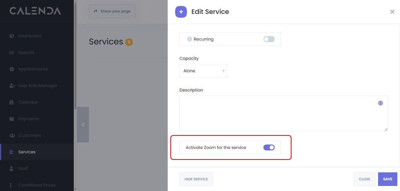 Activate the Service you wish to integrate with Zoom. Edit the Service, then enable the “Activate Zoom for the service” option.