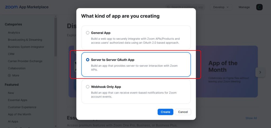 Select “Server-to-Server OAuth App” and name your app as you prefer.