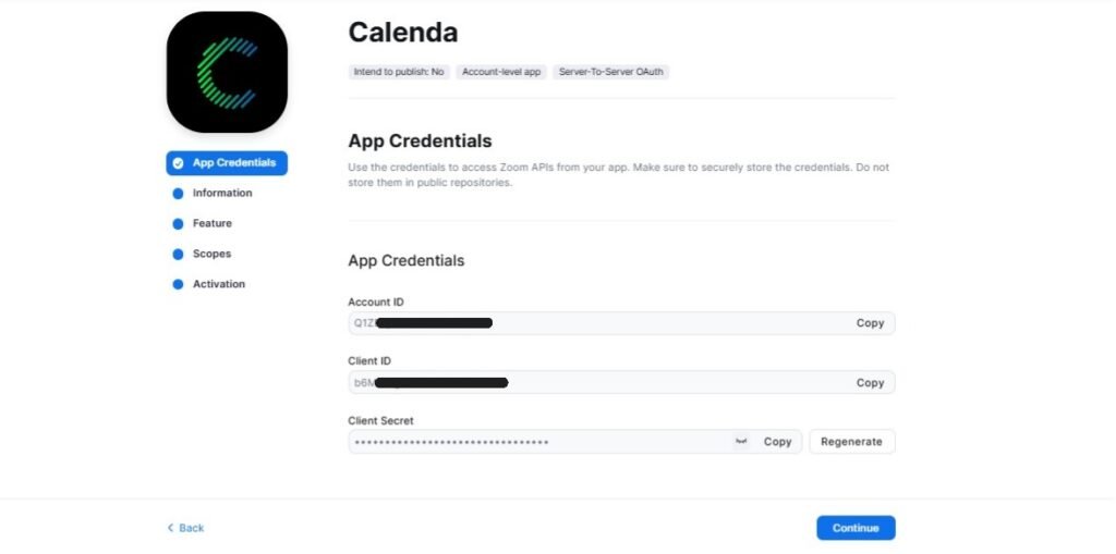 Once your app is created, you will see your App credentials. Make sure to copy these credentials, as you’ll need to add them to Calenda settings.