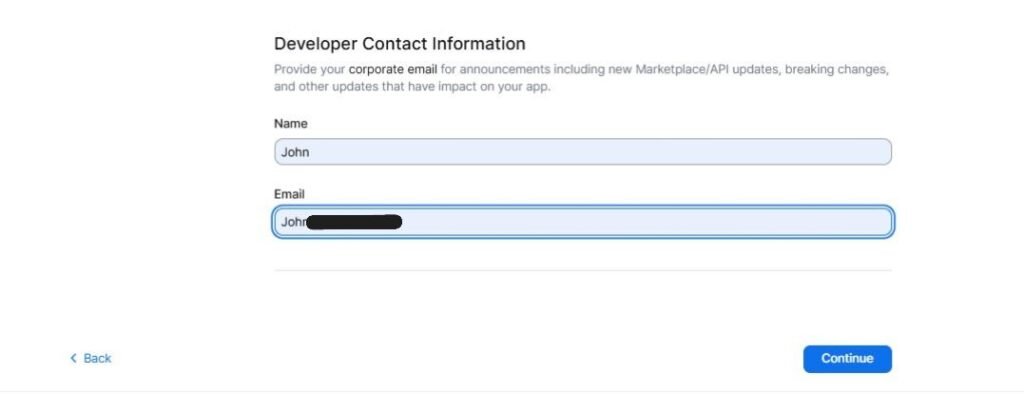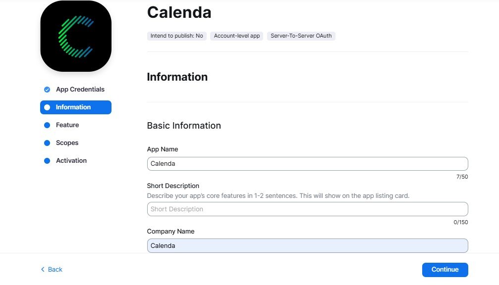 Click “Continue” to proceed, and complete all required fields for your Zoom app. Be accurate and professional to ensure a smooth and functional integration.