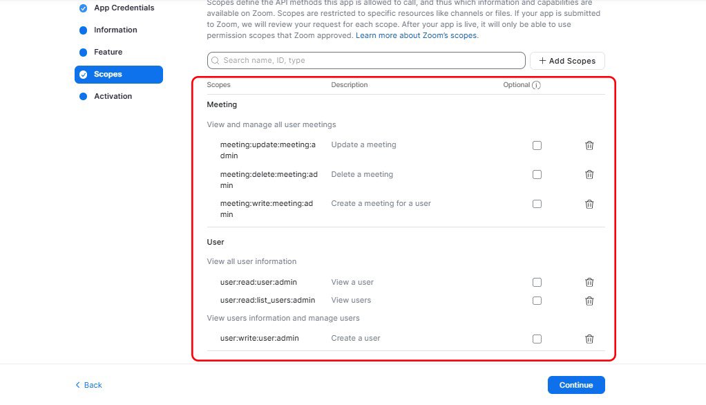 In the next step, add the necessary scopes for your integration, which specify the permissions your app requires to interact with Zoom’s features. Choose the appropriate scopes to match your automation needs.