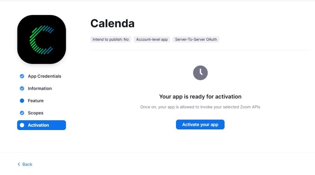 Click on the “Activate your app” button. Now your Zoom app is activated, meaning it’s ready to use in Calenda.