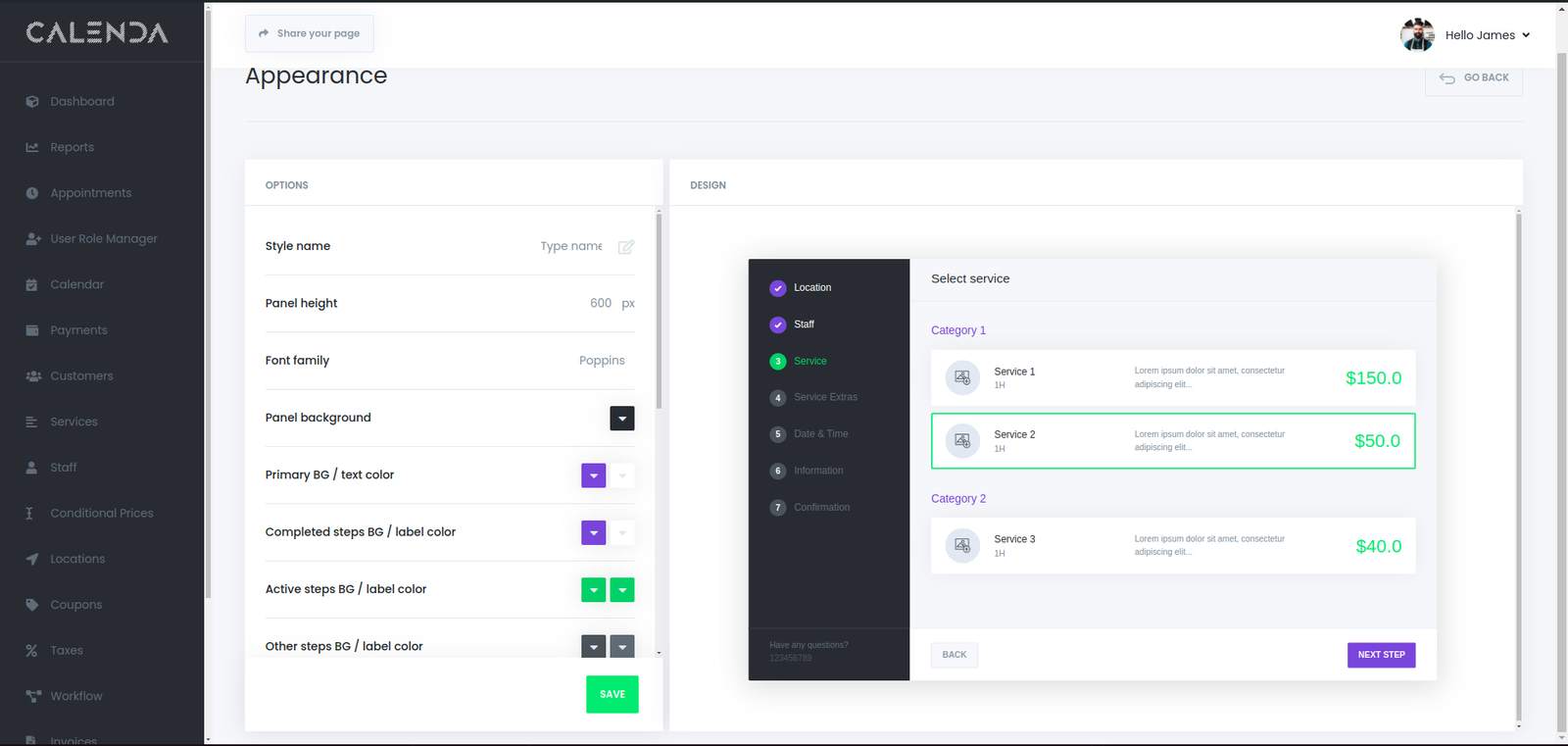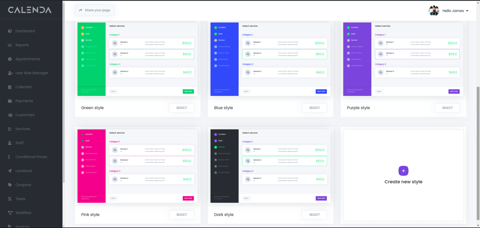 There are six pre-designed style options for selecting services, each featuring a unique color theme.