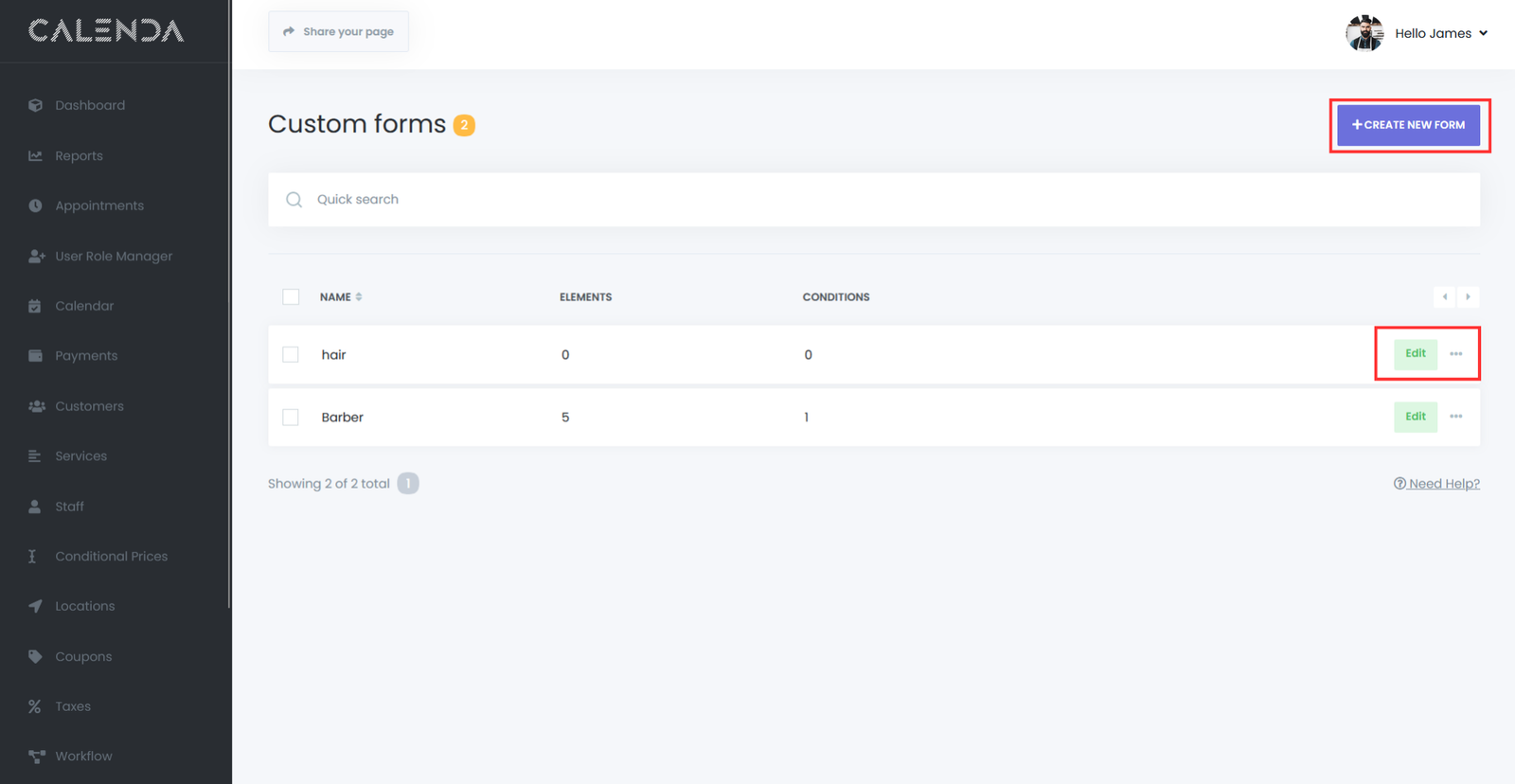 - Next to each form entry is an Edit button. Clicking this button allows users to modify the form, including adding or removing elements, updating conditions, and adjusting settings.