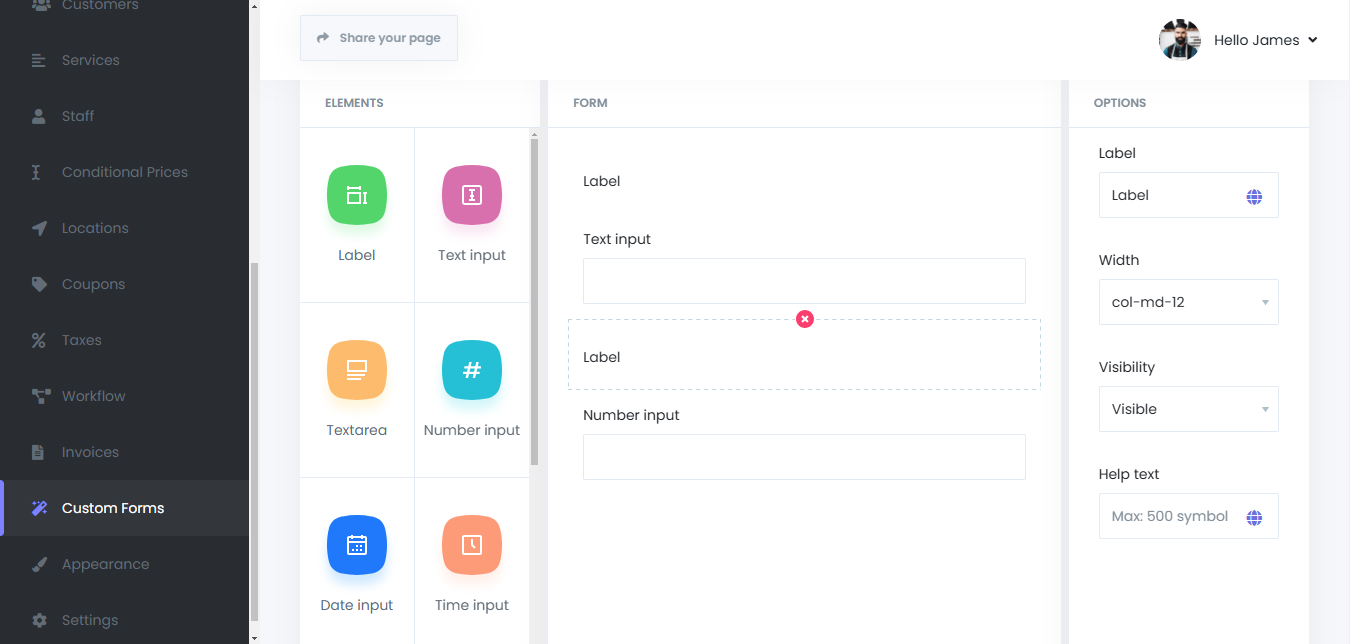 - Form Section: In the center, users can drag elements from the left panel to build their form. The example in the screenshot shows a form with two fields: a text input and a number input, each with a label.