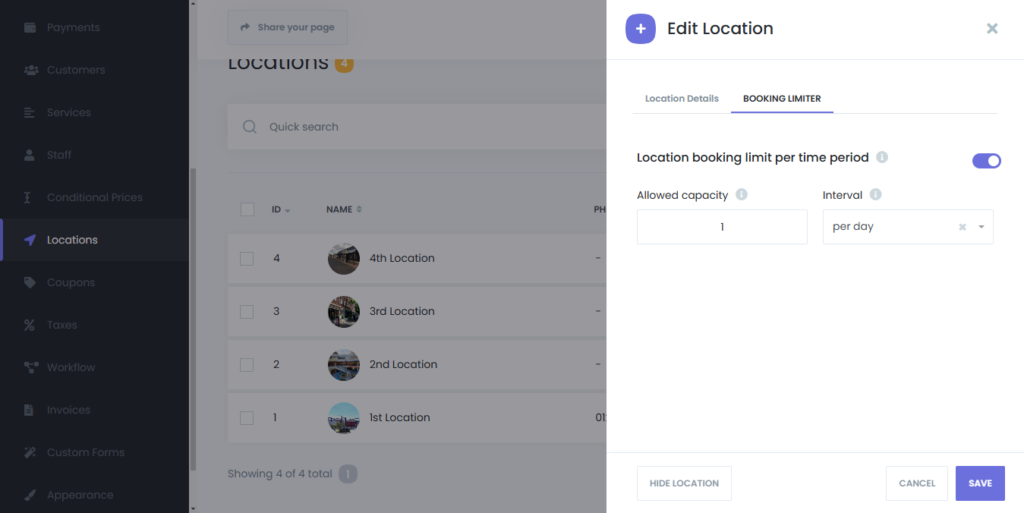 If you headed to Booking Limiter tab, you find a toggle button for Location booking limit per time period. It simply limits the number of bookings at a particular location for a given time frame.