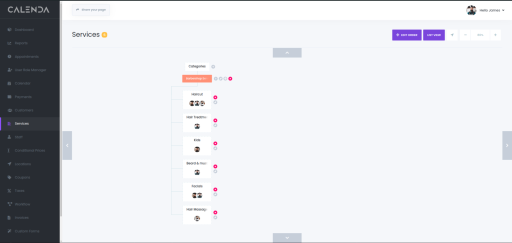 - Sub-services: Each category can have sub-services, represented in this case by services like Haircut, Hair Treatment, Kids, Beard & Mustache, Facials, and Hair Massage.