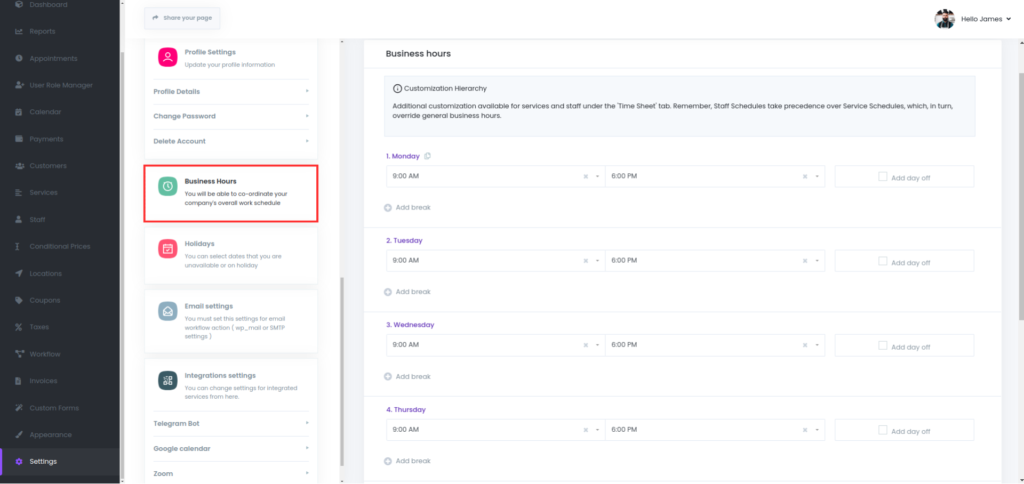 - A notice at the top explaining the customization hierarchy. While you can set general business hours here, additional customization options are available for services and staff under the “Time Sheet” tab. It also highlights that staff schedules take precedence over service schedules, and service schedules override general business hours.