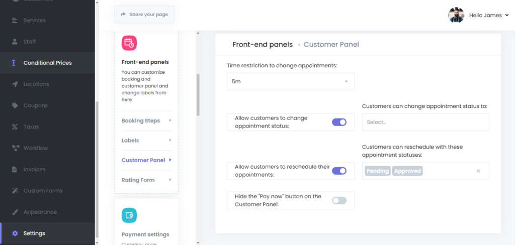 In the “Time restriction to change appointments:”, you can set the time limit for customers to change their booked appointments.