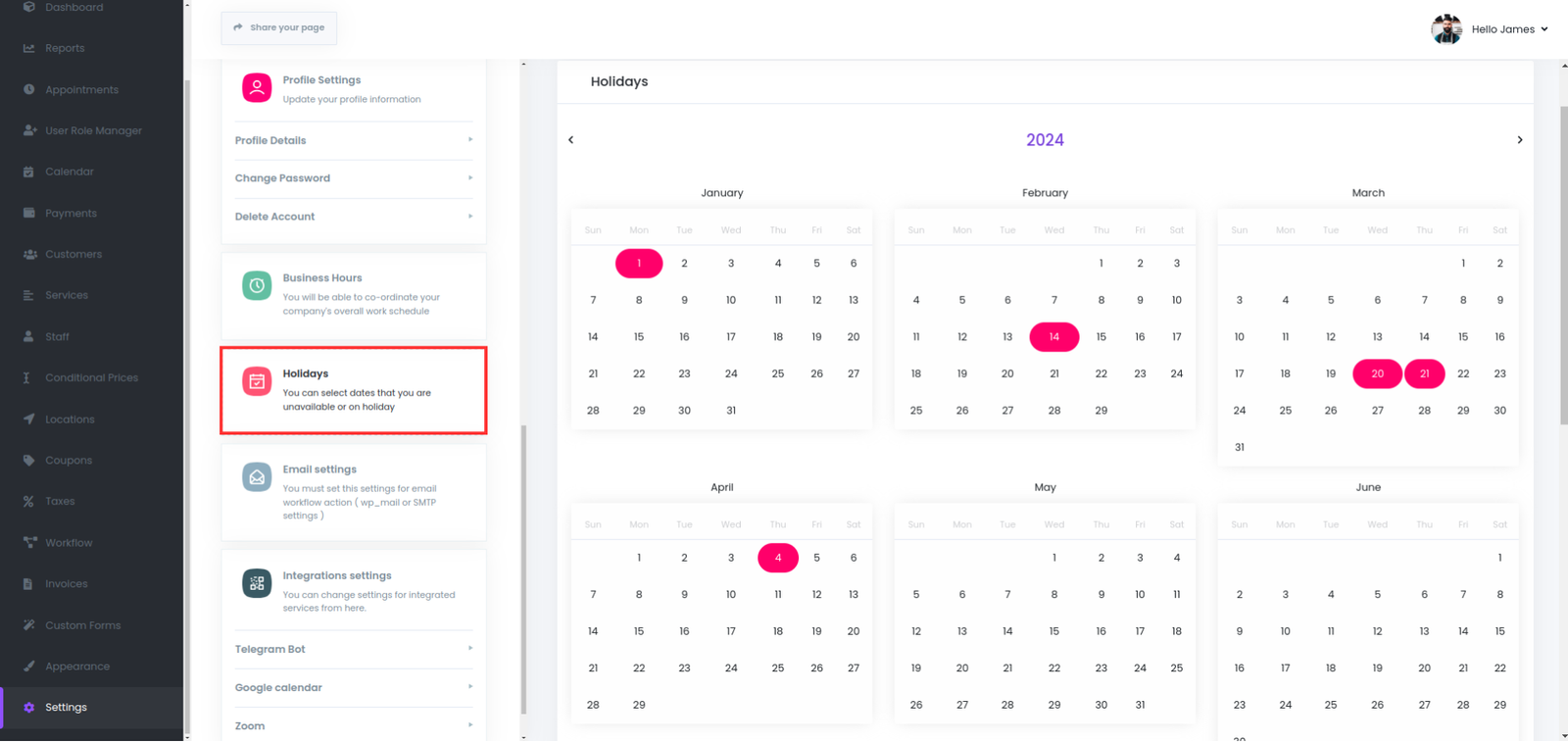 - Any date that has been marked as a holiday is clearly highlighted in pink on the calendar. This helps users quickly identify non-working days.