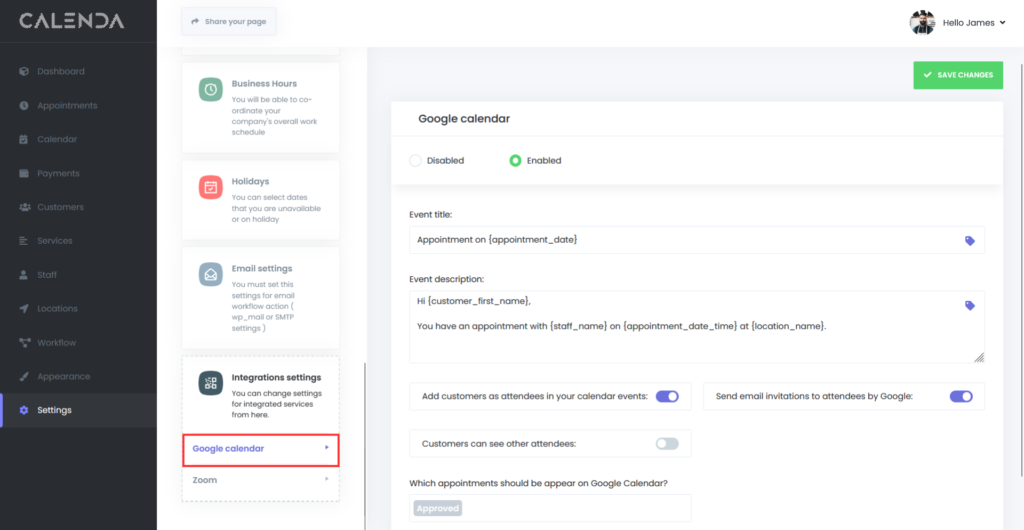• At the top of the settings panel, you can toggle the Google Calendar integration between Enabled or Disabled. When enabled, appointments will sync with your connected Google Calendar account.
